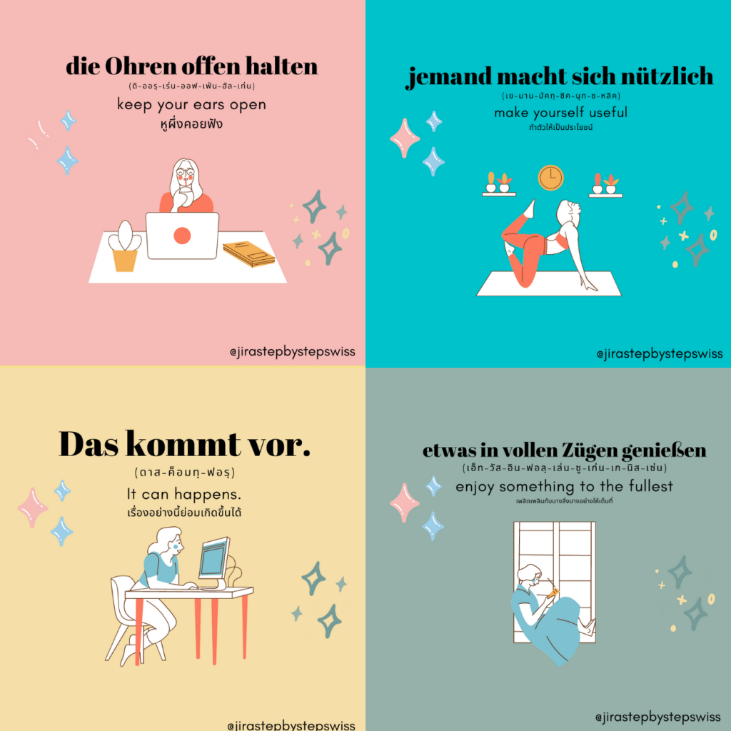 สวัสดีค่ะวันนี้ได้รวบรวมสำนวนภาษาเยอรมัน มีคำอ่าน คำแปลภาษาไทยและภาษาอังกฤษ ดูกันว่าสำนวนเหล่านี้หมายถึงและการใช้อย่างไร การอ่านสำนวนมาก ๆ จะเป็นประโยชน์กับเราอย่างเช่นนำไปเป็นวิธีสร้างหรือแต่งประโยคอย่างง่ายภาษาเยอรมันเบื้องต้นได้ค่ะ